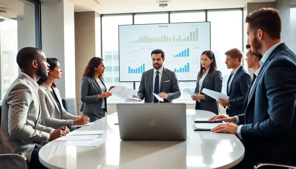 diverse team discussing investment property loan options in a modern office.